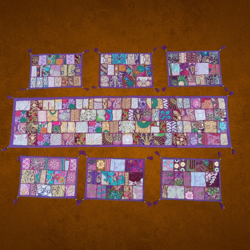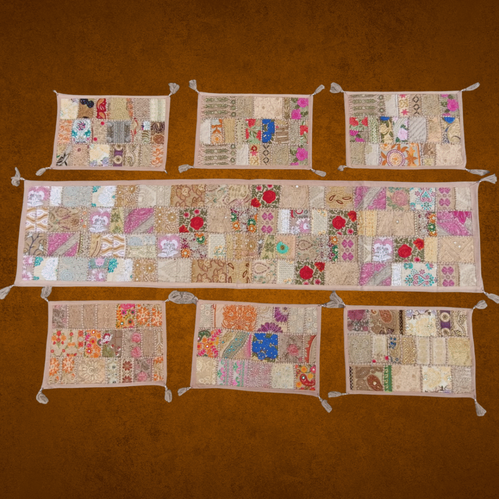 Elevate your dining décor with this Indian Handmade Patchwork Table Runner Set, featuring one long runner and six coordinating table mats. Lovingly stitched by skilled artisans using traditional Kantha techniques, each piece combines vibrant cotton scraps in rich hues—soft pinks, earthy beiges, and subtle metallic accents—into a stunning mosaic. The visible Kantha running stitches lend texture and depth, creating an artisanal look that’s both functional and decorative. This set not only protects your table from spills and scratches but also brings a touch of sustainable elegance and heritage craftsmanship to every meal.